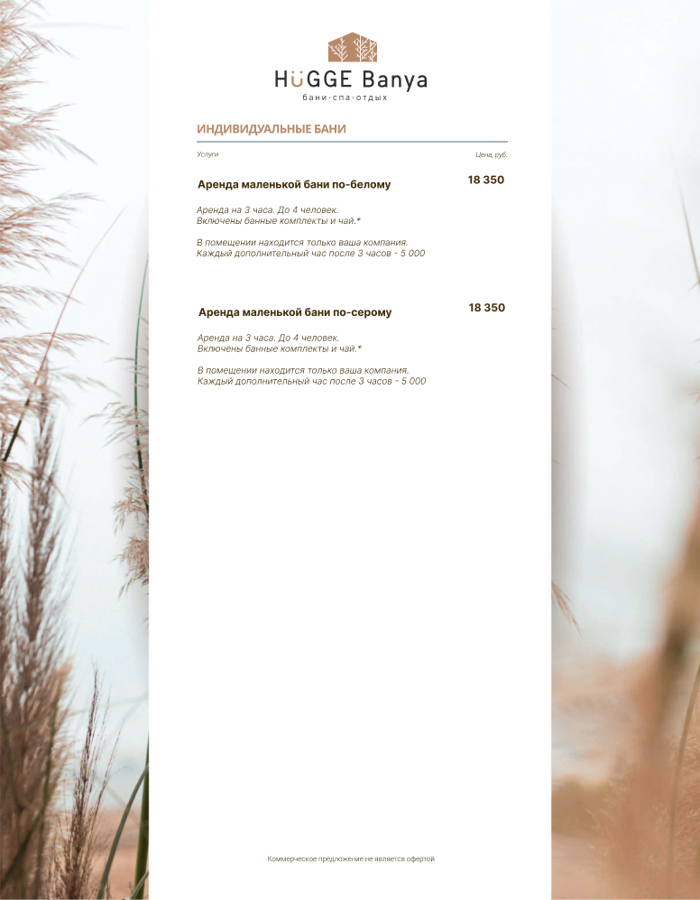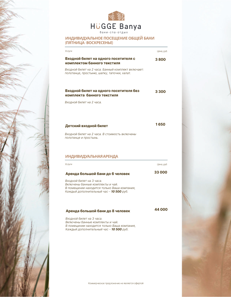 Входит в стоимость: входной билет в общую баню с банным комплектом, можжевеловые веники — 1, пихтовые веники — 2, дубовые веники — 2, травы для заваривания, чайник чая с угощениями.