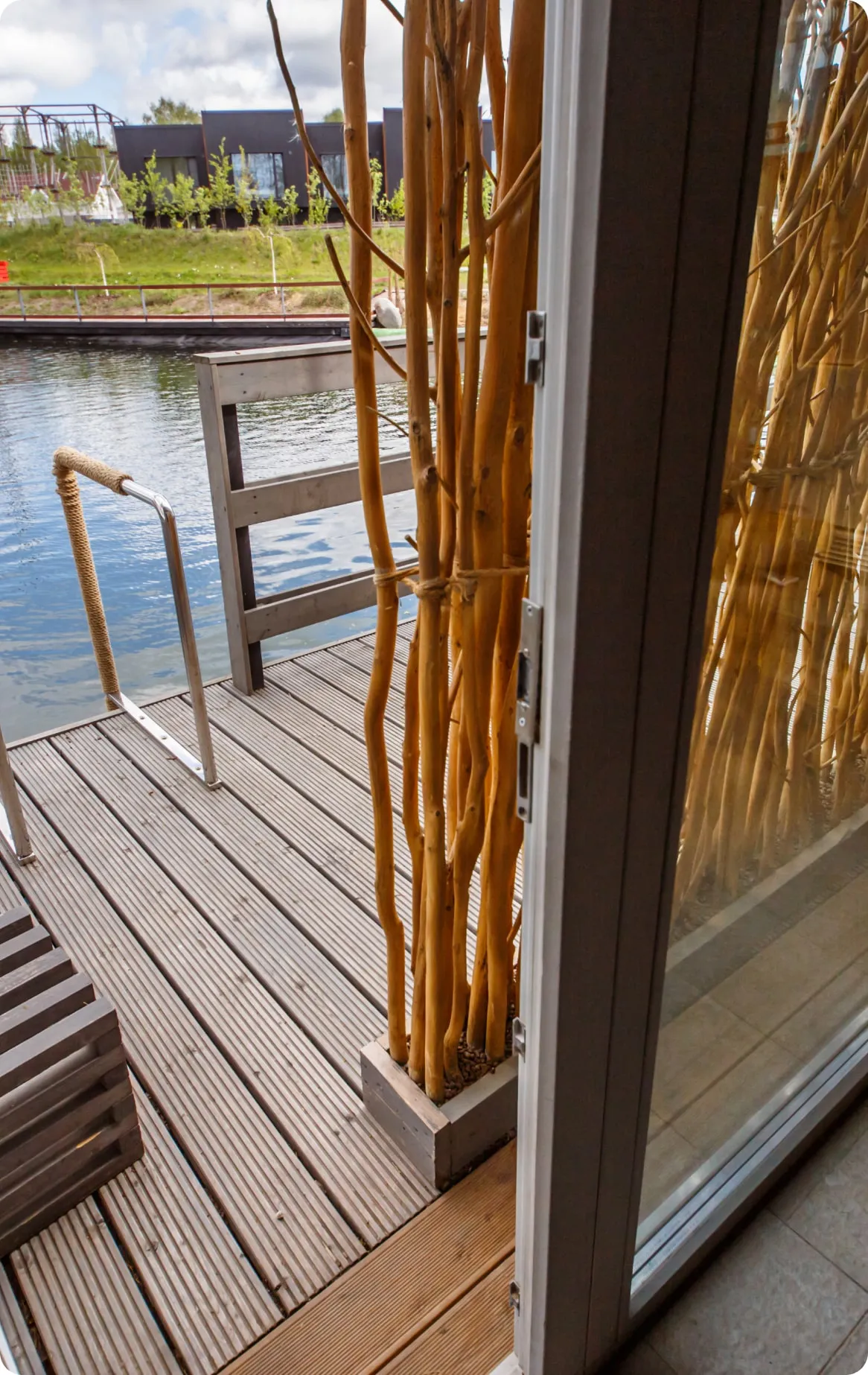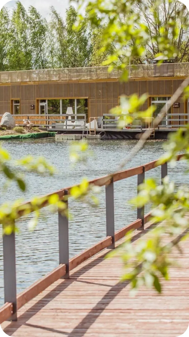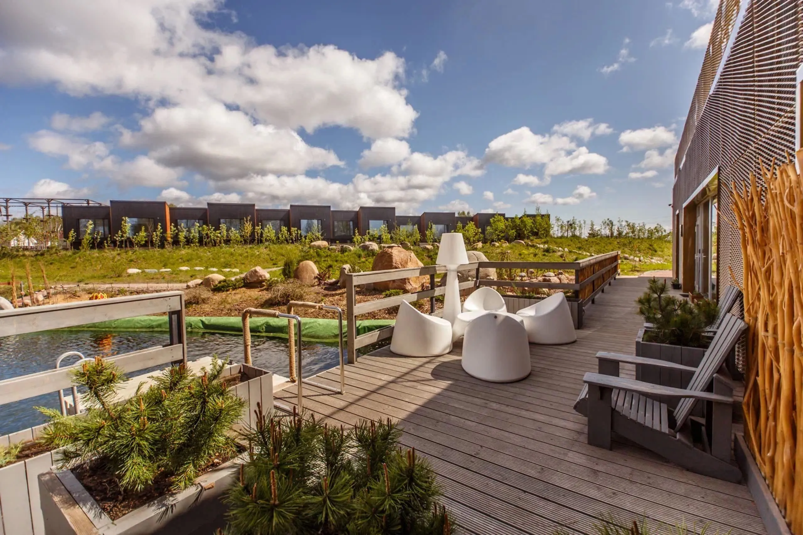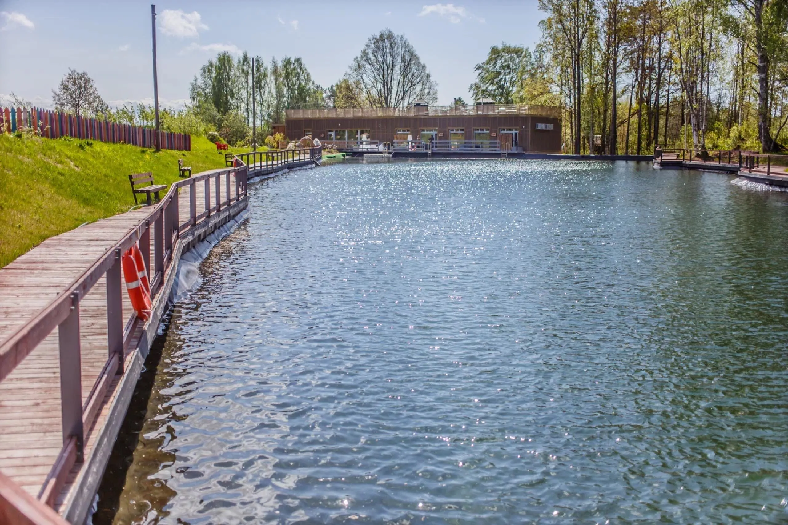 Посетите также зону отдыха с диваном, телевизором, столиком, стульями или террасу с видом на озеро, где в зимнее время можно искупаться в купели, а летом — в теплой воде озера.