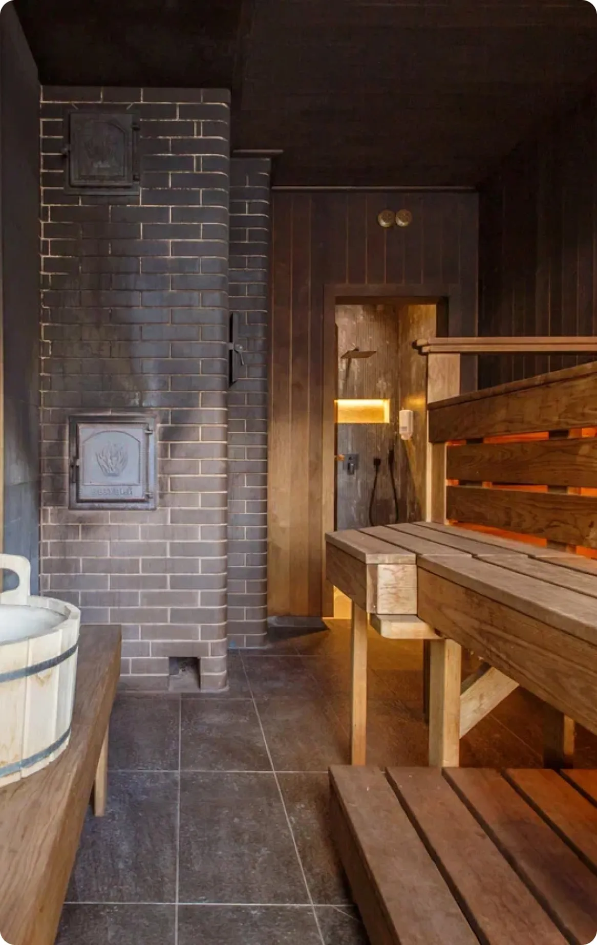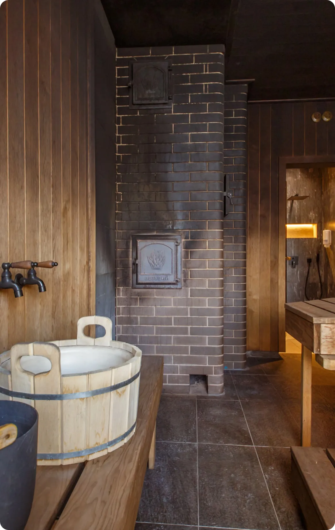Подойдет для одной небольшой компании (до 4 человек). В печах находится полудрагоценный минерал — нефрит. Нефритовый пар известен своим благотворным влиянием на оздоровление организма, обладает антисептическими и омолаживающими свойствами.