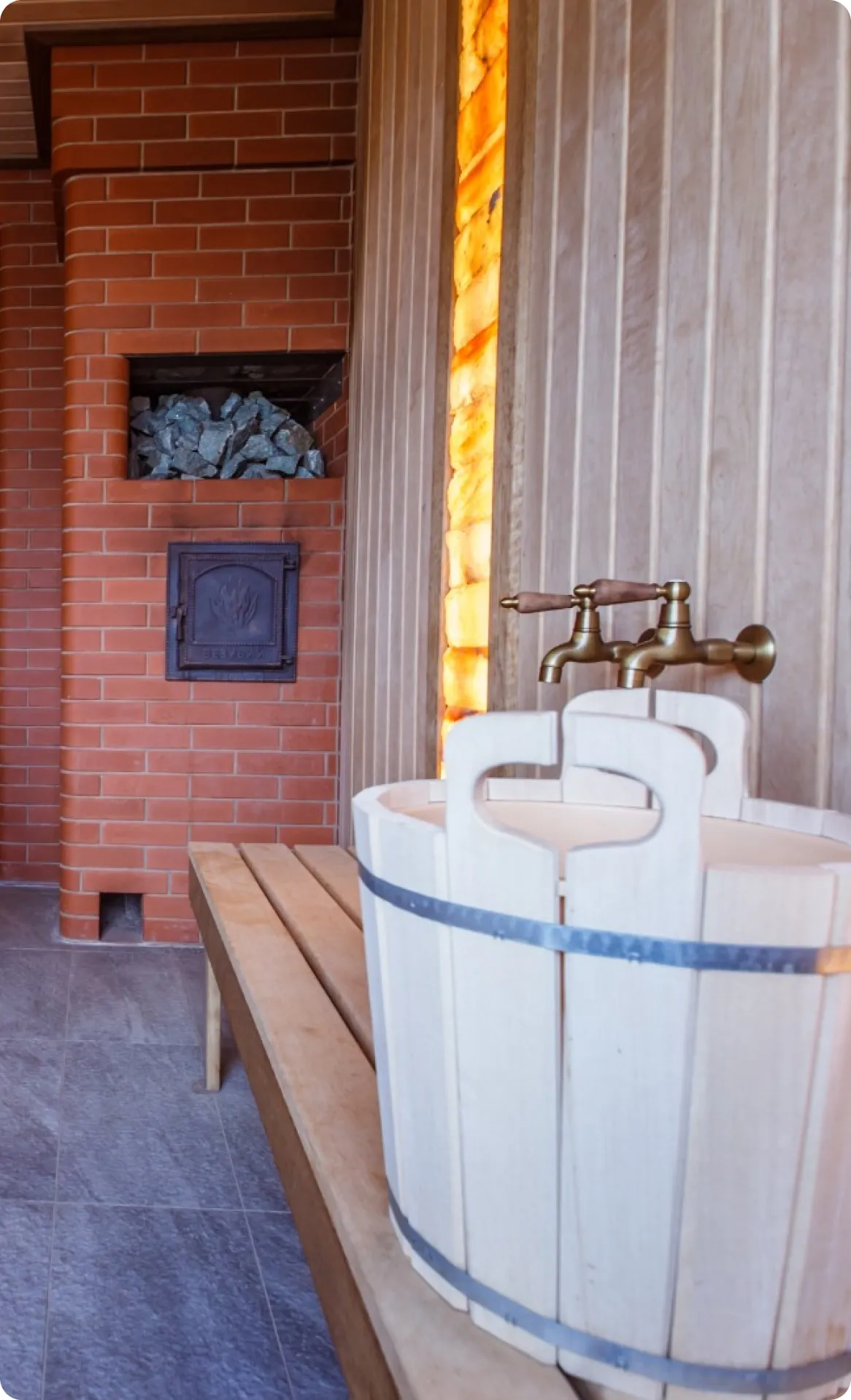 Пар-мастер бережно прогревает все тело дубовыми вениками, используя классические техники парения. После первого десятиминутного прогрева следует процедура контрастного обливания в душе впечатлений или в купели озера.