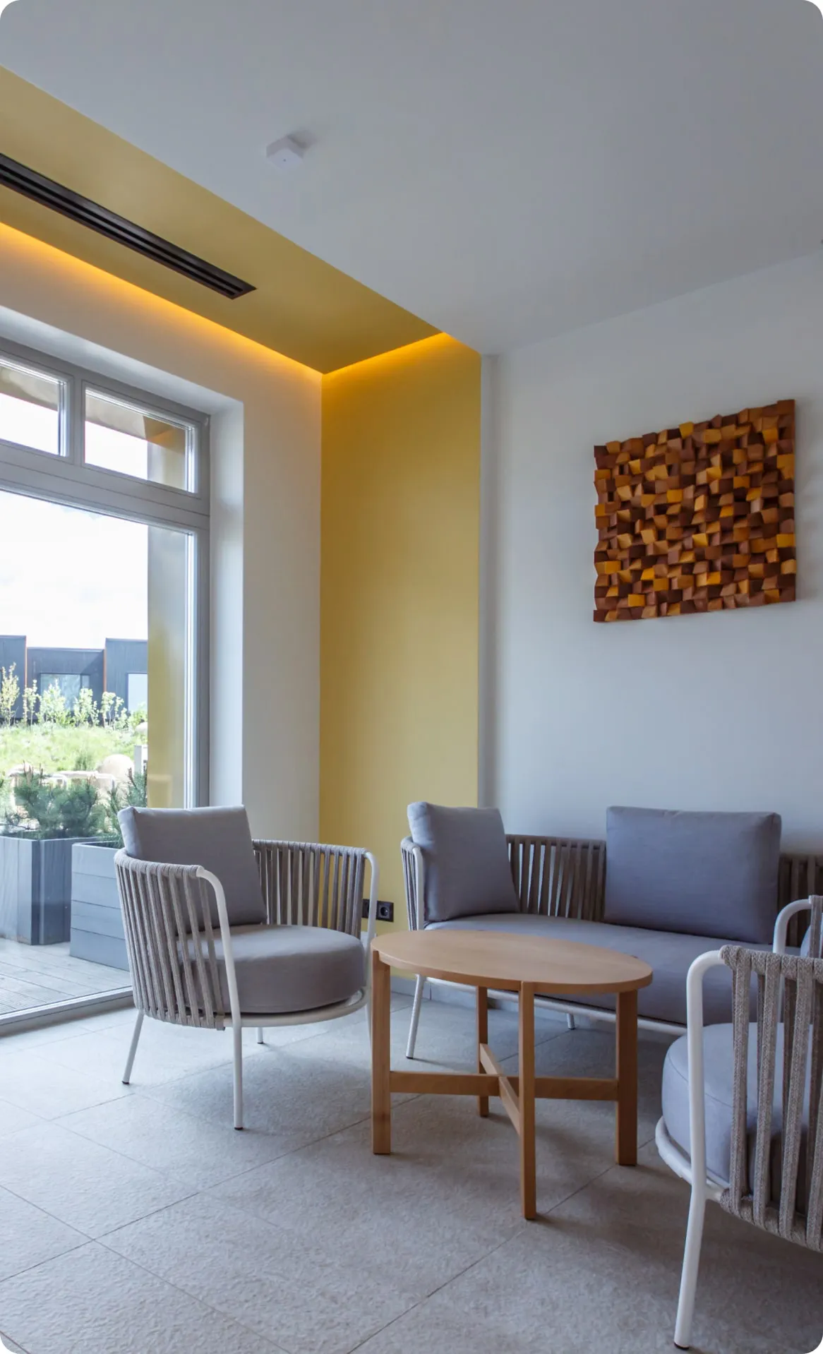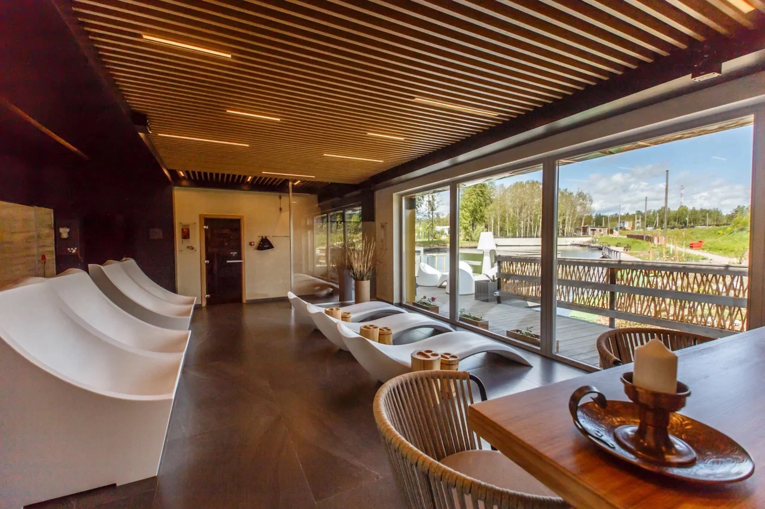 До или после процедур Вы сможете посетить зону отдыха с диваном, телевизором, столиком, стульями или террасу с видом на озеро, где в зимнее время можно искупаться в купели, а летом — в теплой воде озера.